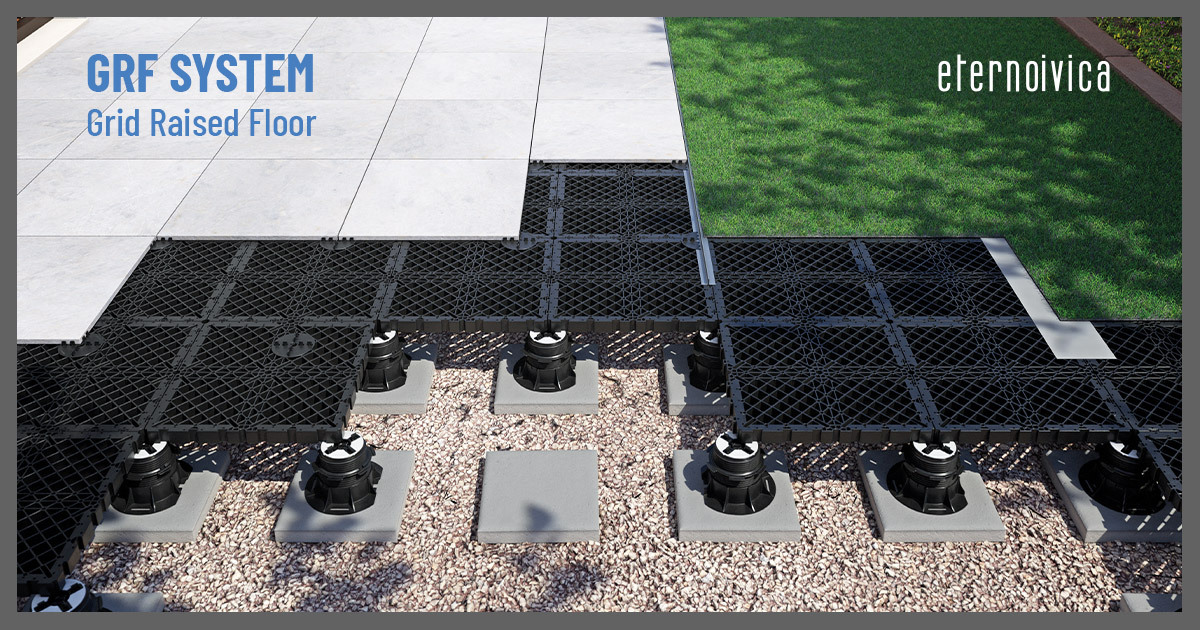 Az álpadlós rendszerek nagy szabadságot biztosítanak a tervezésben. A nagyméretű, 2 cm-es teraszlapok modern megjelenést eredményeznek. A fugákegyenletesek, a burkolat rendezett és elegáns. Lehetőség van különböző anyagok kombinálására is – például greslap és műfű egymás mellé helyezésére, ehhez az Eternoivica GRF rendszere kínál megoldást.